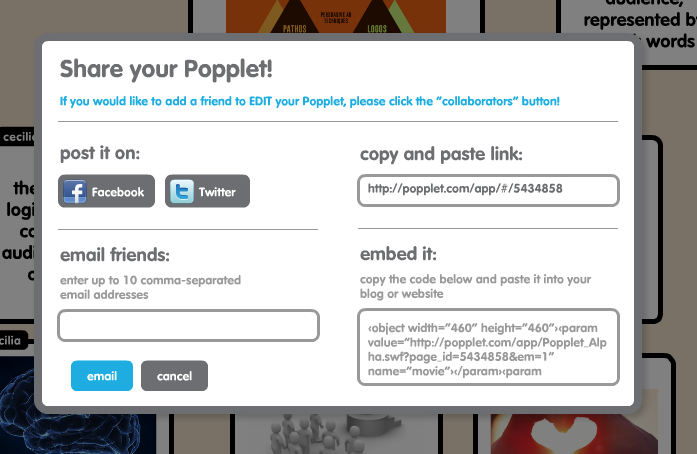 Yes, they can share the link. Other users can also immediately share your work on Twitter and Facebook. They can even embed your work on a website or blog post using the popplet embed code. Popular popplets will drive traffic to a website! Will other users be able to edit my work if I share it in Public Popplets? No, to do this you, as the Popplet’s author would need to add another person as a collaborator and specifically grant editing permissions.