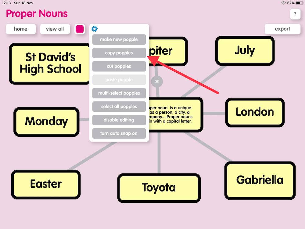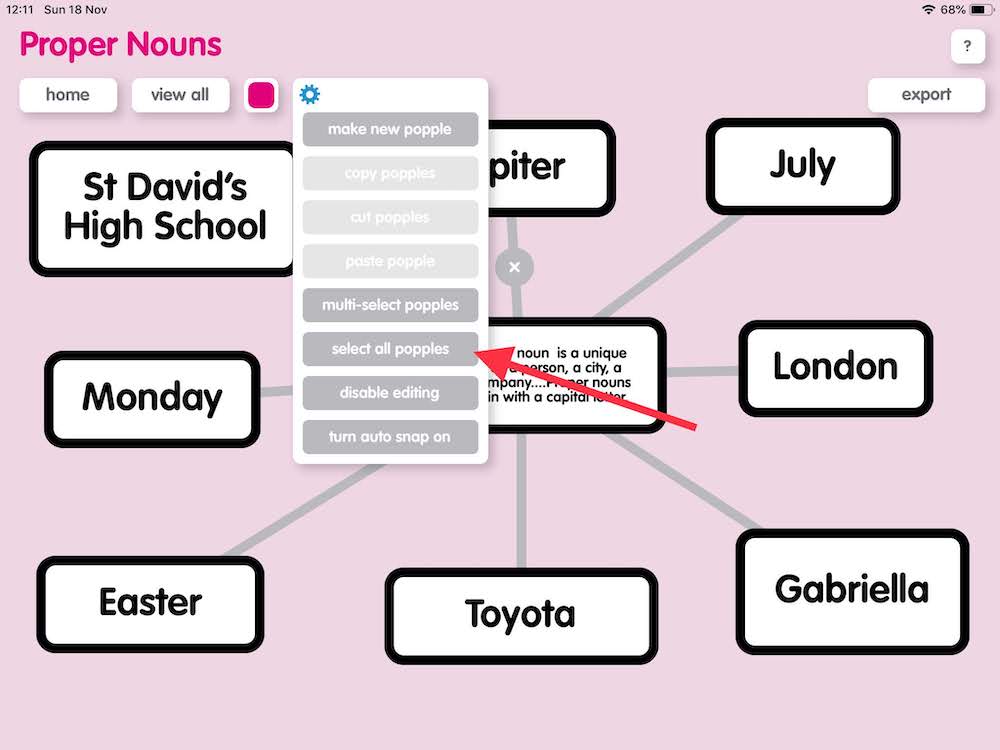 - Now we’re simply going to copy and paste all the popples from this popplet into the popplet in the online tab. Begin by tapping the blue cog menu, then tap select all popples (selected popples will turn yellow). Alternatively, tap popples with two fingers to select them: